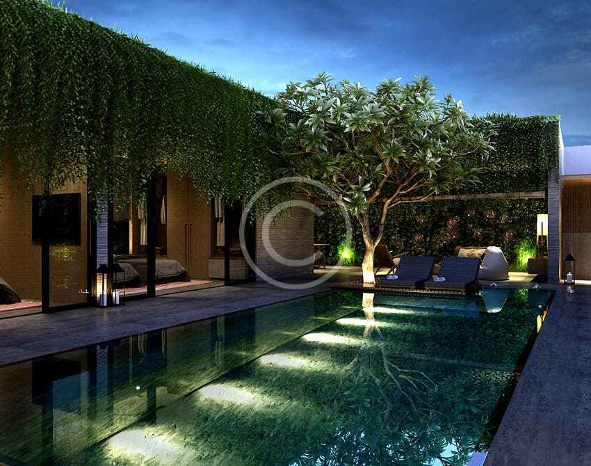 Lush greenery surrounds serene poolside retreat with elegant evening ambiance